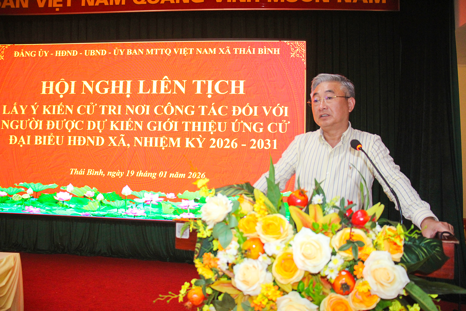 Chiều 19/1 , Đảng ủy – HĐND – UBND – Ủy ban MTTQ Việt Nam xã Thái Bình đã tổ chức Hội nghị liên tịch lấy ý kiến cử tri nơi công tác đối với người được dự kiến giới thiệu ứng cử đại biểu Hội đồng nhân dân xã, nhiệm kỳ 2026 – 2031.