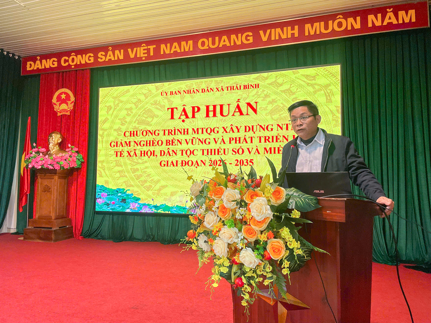 Chiều 29/12, UBND xã Thái Bình tổ chức tập huấn nâng cao năng lực cho đội ngũ cán bộ cơ sở trong thực hiện chương trình MTQG xây dựng NTM, Giảm nghèo bền vững và phát triển kinh tế xã hội vùng đồng bào dân tộc thiểu số và miền núi giai đoạn 2026-2035. Dự hội nghị có đồng chí Hà Đức Hùng, Uỷ viên BTV Đảng uỷ, Phó Chủ tịch UBND xã; Giám đốc Trung tâm Dịch vụ công xã; đại diện Chi cục Phát triển nông thôn và Quản lý chất lượng, Sở Nông nghiệp và Môi trường tỉnh Tuyên Quang.